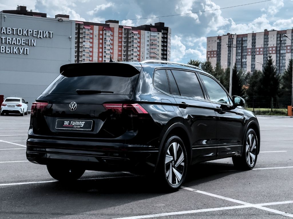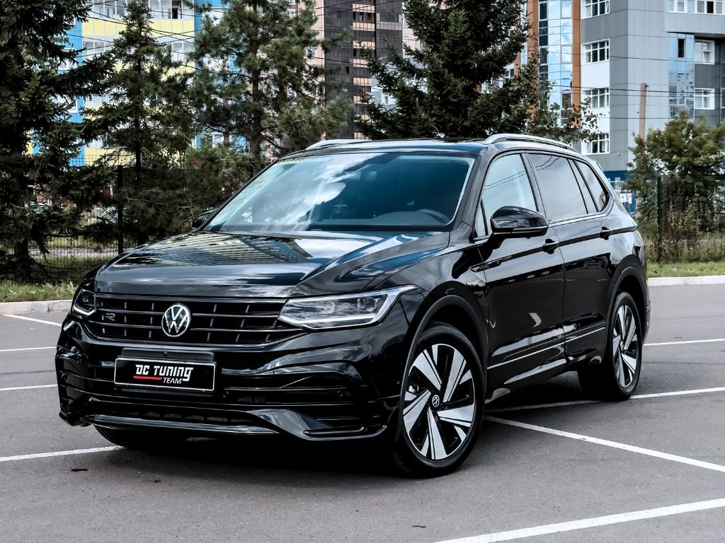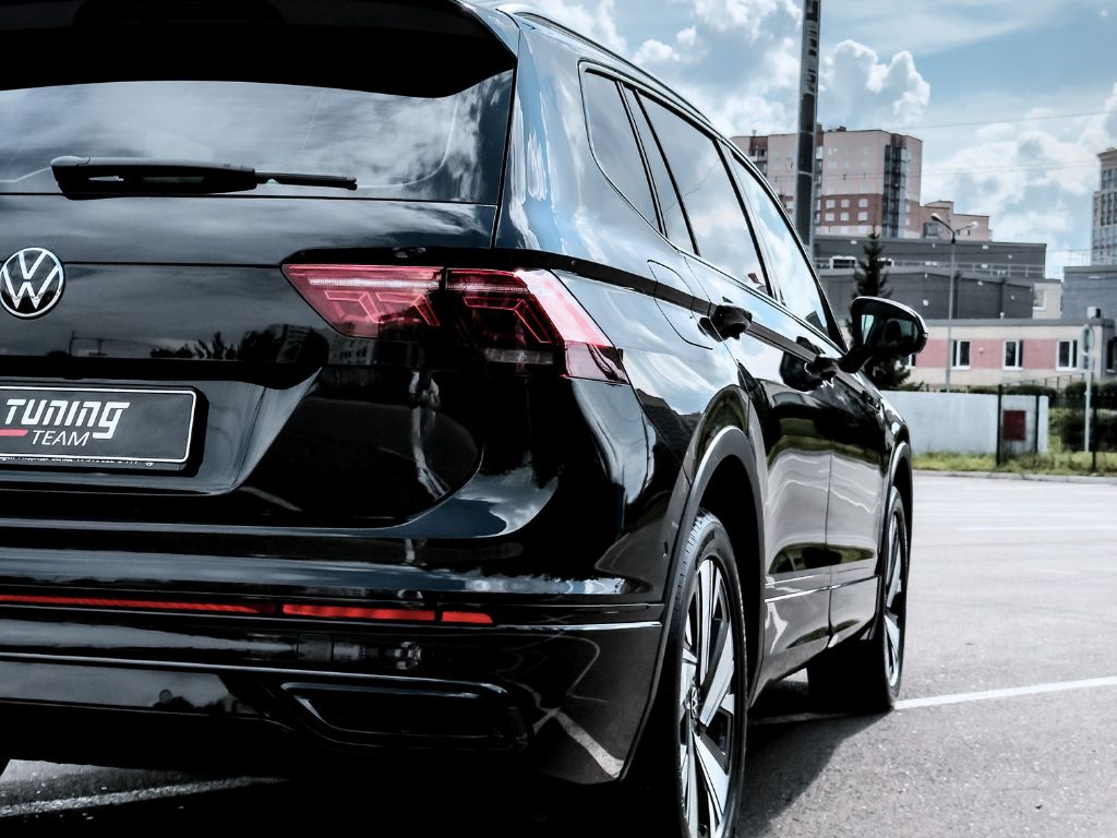 Tiguan — оклейка всей передней части плёнкой по пакету Оптимум+. Дополнительно защитили бронеплёнкой салон: кнопки на руле, экран мультимедиа, блок климат-контроля. Обработали глянцевые стойки дверей, нижние части дверей, передние пороги, хромированные вставки на порогах, эмблему VW и панорамную крышу.